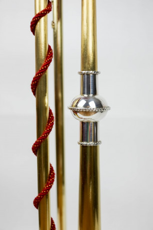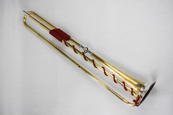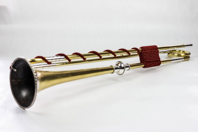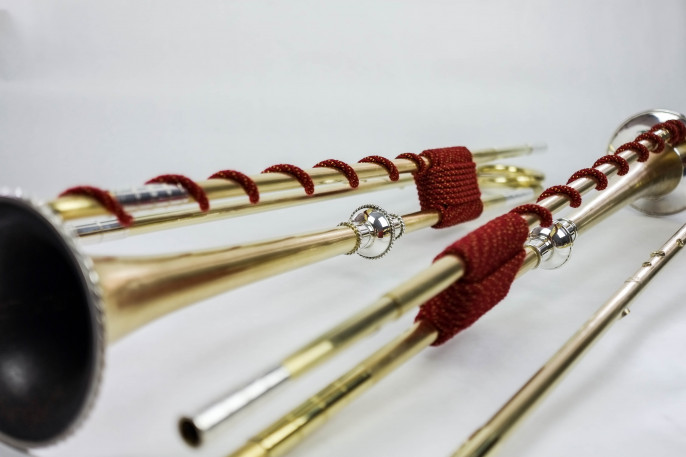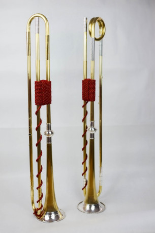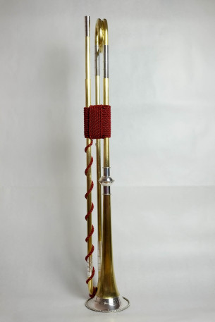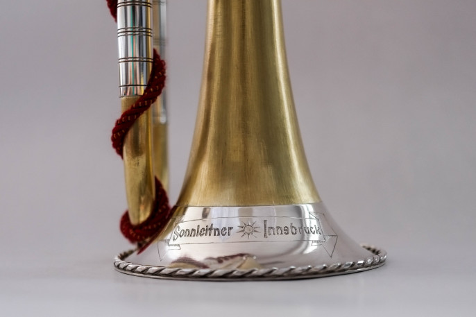 4-Loch Naturtrompete. Messing, Sterlingsilber. Handgehämmertes Schallstück nach J. L. Ehe. Alle Rohre und Bögen genahtet. Bögen, Mundrohre und Grifflochrohre für die Stimmungen C440, D440, C415 und D415.