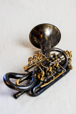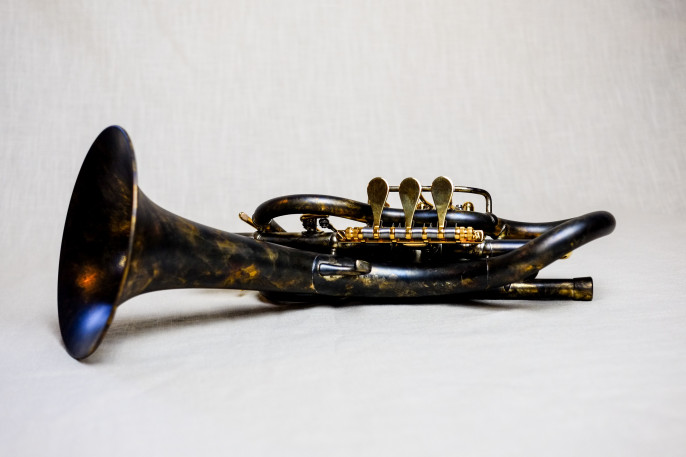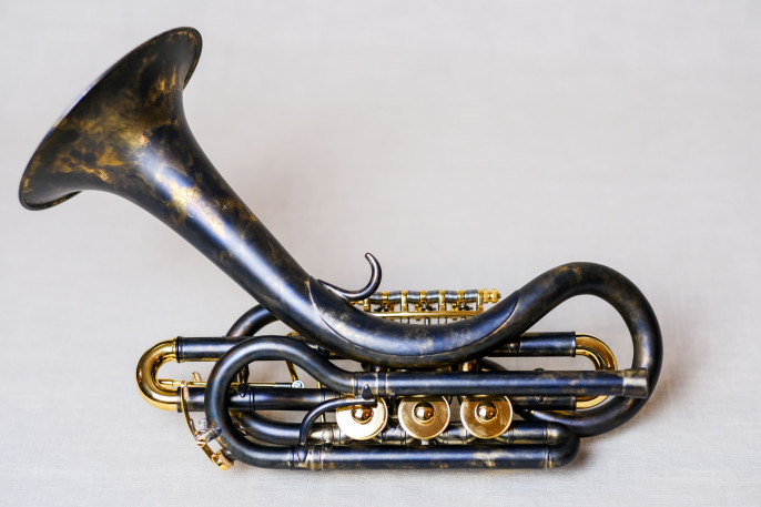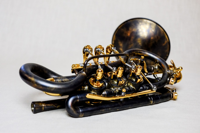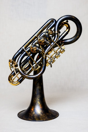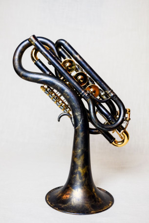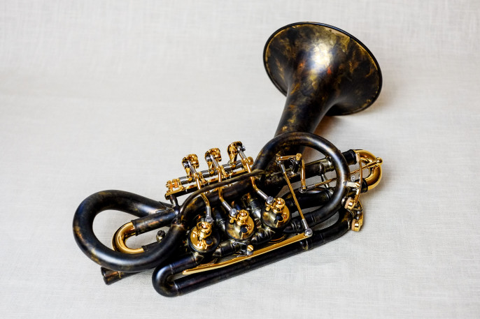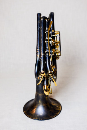 Goldmessing. Wandstärke 0,45 mm. Meinlschmidt-Maschine, Bohrung 11,00 mm. Trigger am 3. Ventil. Vintage-Finish von Martin Böhme.